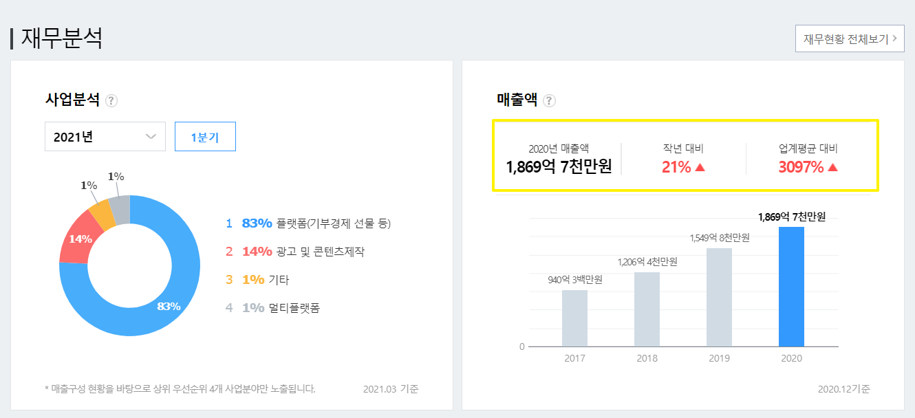 매출은 보시다시피 플랫폼 매출이 거의 대부분을 차지하고 있고요. 광고 및 콘텐츠 제작으로 인한 매출이 그 뒤를 따르고 있습니다.