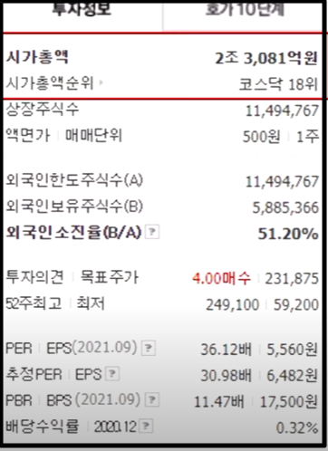 시가 총액도 2조 3000억원을 넘었고, 이는 코스닥 18위를 기록하고 있습니다. 2021년 들어서 급속도로 성장했기 때문에 그전에 매수를 하신 분들은 지금 큰 수익을 얻고 계실 거라 생각이 드는데요.