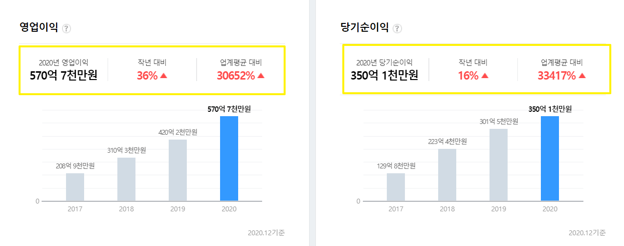 영업이익도 2020년 대비 36%가 증가하였고 당기순이익도 16% 증가하였습니다.