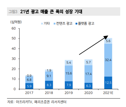 2020년 Afreeca TV는 294억의 광고 매출을 기록하였고, 2021년에는 539억의 광고매출을 이루어냈습니다. 이는 한해동안 83%의 광고매출 수익률을 나타내는대요.