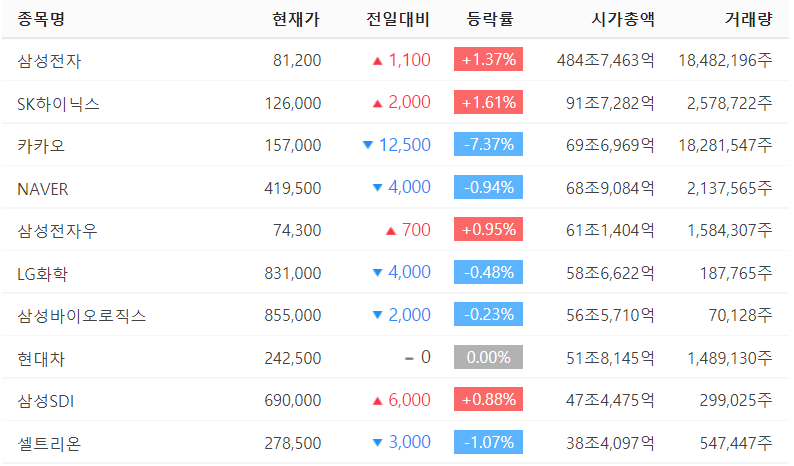 카카오는 개인이 424억원을 매수하면서 급등했고 반면에 기관이 298억원 외국인이 133억원을 매도했습니다. 네이버는 반대였는데요. 기관이 1318억원과 외국인이 945억원을 매수했고 개인이 2309억원을 매도했습니다. 두 기업 모두 23일 기준 시가총액이 5조원 정도 늘어남으로써 현재 3위 경쟁이 치열한 상태입니다. 카카오가 75조 가량 네이버가 69조 가량으로 시총의 격차는 5조 이상으로 밝혀졌습니다.